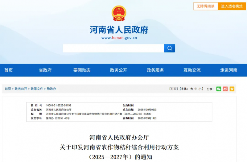 《河南省农作物秸秆综合利用行动方案(2025—2027年)》已经省政府同意,现印发给你们,请认真贯彻落实。