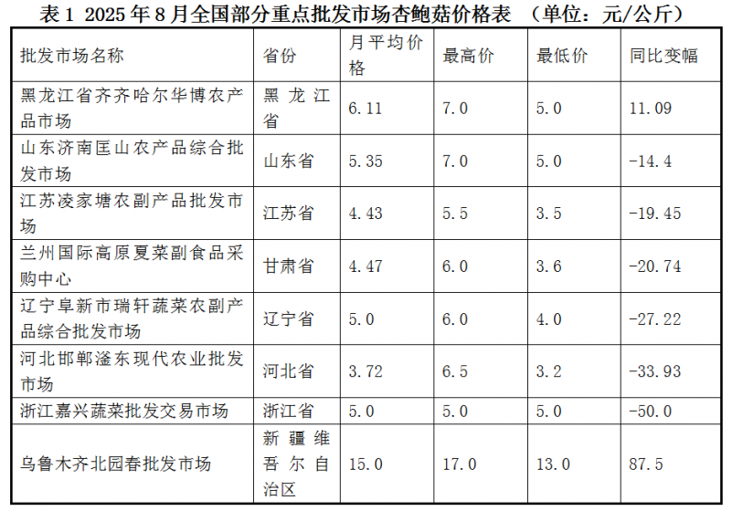 从各省重点监控批发市场来看,同比价格上升的占35.09%,下降为59.65%,乌鲁木齐北园春批发市场、浙江嘉兴蔬菜批发交易市场、河北邯郸滏东现代农业批发市场等35个市场同比变幅超过10%。重点监控批发市场价格同比变化,反映出该批发市场所在省份同比价格的较大变幅。部分重点监控批发市场8月份杏鲍菇价格数据如下表1所示: