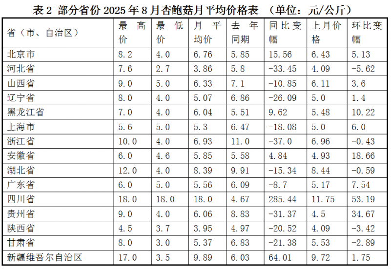对2025年8月各批发市场杏鲍菇价格按省份汇总平均价格数据显示,各省价格呈现区域性分化,其中四川省、新疆维吾尔自治区、北京市等8个省份价格同比上涨,浙江省、河北省、贵州省等12个省份价格同比下降。其中变幅超过15%的省份有北京市、河北省、辽宁省、上海市、浙江省、湖北省、四川省、贵州省、陕西省、甘肃省、新疆维吾尔自治区,同比变幅分别为15.56%、-33.45%、-26.09%、-18.08%、-37.00%、-15.34%、285.44%、-31.37%、-20.52%、-21.38%、64.01%。如下表2所示: