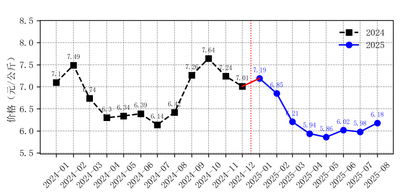 图1 2024年-2025年1-8月全国杏鲍菇平均价格走势图