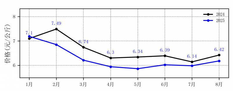 图2 2024年-2025年1-8月杏鲍菇价格对比图
