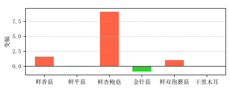 截至9月30日六个单品品种价格指数4升2降。其中涨幅最大的是鲜杏鲍菇较上期相比涨幅为9.20%。其中降幅最大的是金针菇较上期相比降幅为0.94%。