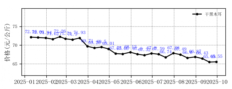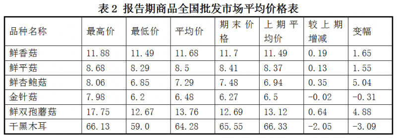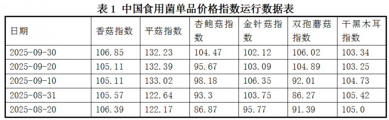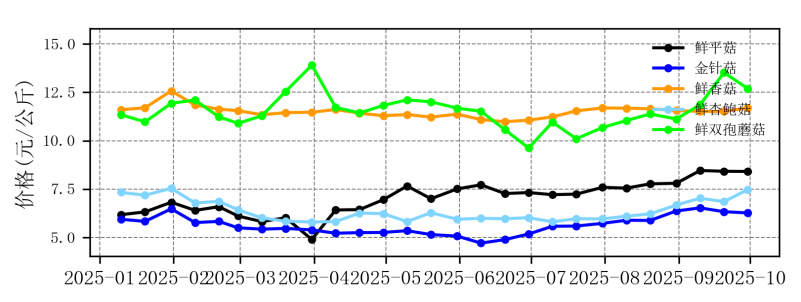 2025年9月21日-30日鲜平菇、鲜香菇、鲜双孢蘑菇、鲜杏鲍菇本期平均价格较上期平均价格上涨,涨幅分别为1.55%、1.65%、4.88%、5.04%。干黑木耳、金针菇本期平均价格较上期平均价格下降,降幅分别为3.09%、0.31%。
