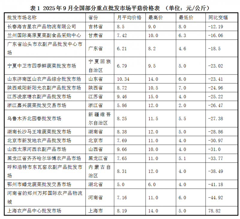 从各省重点监控批发市场来看,同比价格上升的占14.43%,下降为81.44%,福州海峡蔬菜批发市场、上海农产品中心批发市场、河南省的郑州万邦国际农产品物流城等79个市场同比变幅超过10%。重点监控批发市场价格同比变化,反映出该批发市场所在省份同比价格的较大变幅。部分重点监控批发市场9月份平菇价格数据如下表所示: