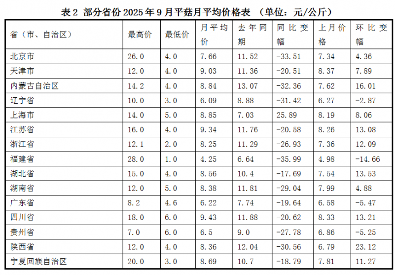 对2025年9月各批发市场平菇价格按省份汇总平均价格数据显示,超9成省份价格同比下降,其中变幅超过15%的省份有北京市、天津市、内蒙古自治区、辽宁省、黑龙江省、上海市、江苏省、浙江省、福建省、湖北省、湖南省、广东省、四川省、贵州省、陕西省、宁夏回族自治区,同比变幅分别为-33.51%、-20.51%、-32.36%、-31.42%、-16.54%、25.89%、-20.58%、-26.93%、-35.99%、-17.69%、-29.04%、-19.64%、-20.62%、-27.78%、-30.56%、-18.79%。如下表所示: