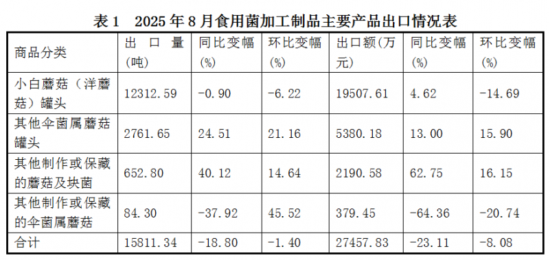 根据海关发布数据统计,我国食用菌加工制品出口商品目前包含4种,其中主要出口商品包含小白蘑菇(洋蘑菇)罐头、其他伞菌属蘑菇罐头、其他制作或保藏的蘑菇及块菌、其他制作或保藏的伞菌属蘑菇。8月食用菌加工制品合计出口量15811.34吨,出口总额27457.83万元。同比2024年8月,出口量下降3661.71吨(降幅18.8%),出口额下降8254.87万元(降幅23.11%),环比2025年7月,出口量下降224.06吨(降幅1.4%),出口额下降2414.69万元(降幅8.08%)。如下表所示: