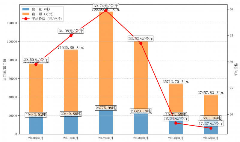 图1 2020-2025年8月食用菌加工制品出口量/出口额/平均价格对比图