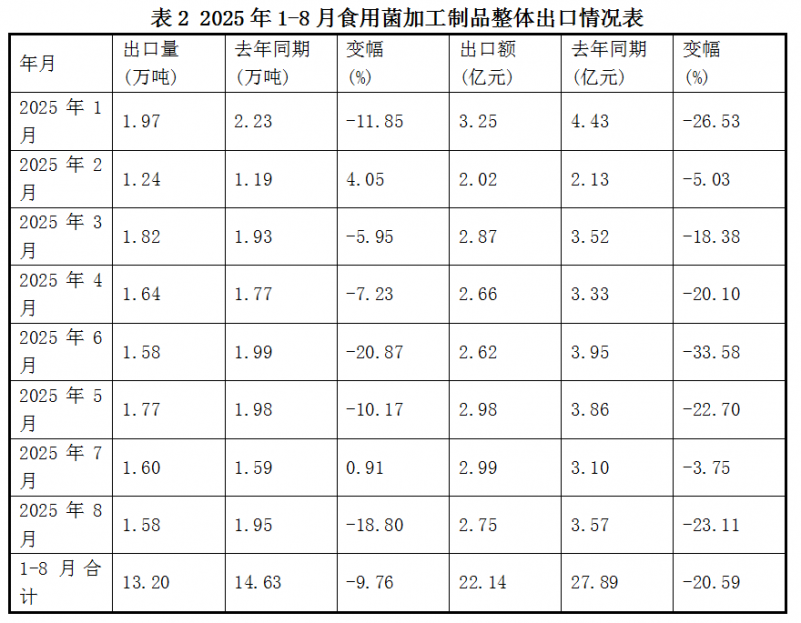 2025年1-8月我国食用菌出口总量同比去年食用菌加工制品呈现量价同减特征,出口总量132024.72吨,同比减少9.76%,出口总额221448.26万元,同比下降20.59%。8月出口量同比下降18.8%,至15811.34吨,出口额下降23.11%,至27457.83万元。2025年1-8月我国食用菌加工制品整体出口情况如下表所示: