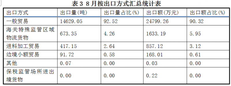 我国食用菌加工制品出口主要通过一般贸易(8月出口量占比92.52%)、边境小额贸易(占比0.58%)等方式进行,如下图所示:按贸易分类8月食用菌加工制品出口情况如下表所示: