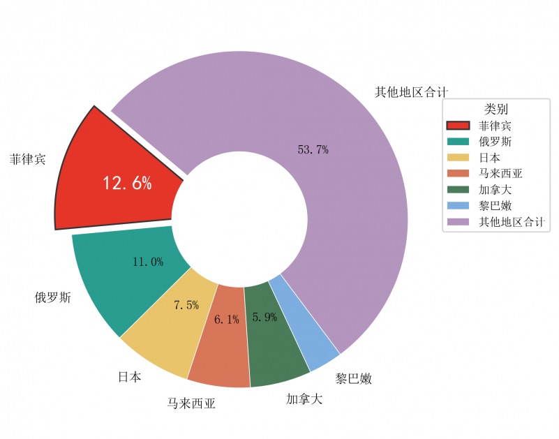 8月份我国食用菌加工制品出口主要目的地包含东南亚、东欧、中东、东亚等地区,其中东南亚、东欧、中东三个地区占我国食用菌加工制品出口量的51.54%。分别占比为24.98%、13.7%、12.86%。8月我国食用菌加工制品出口目的地包含菲律宾、俄罗斯、日本、马来西亚、加拿大等共计101个国家及地区。占比如下图所示: