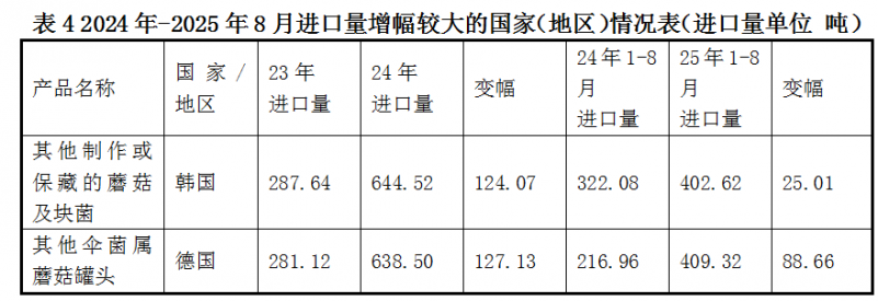根据数据统计,部分国家(地区)2024年-2025年8月进口我国食用菌加工制品产品的数量发生了较大变化,需进一步关注。如下表所示: