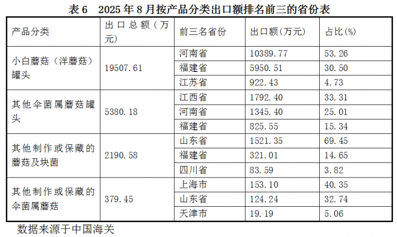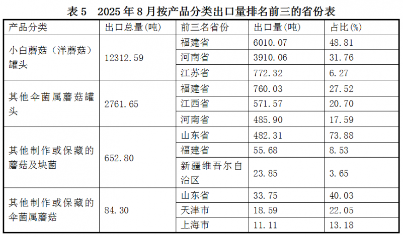 2025年8月我国食用菌加工制品出口总量为15811.34吨,出口量排名前三的省份是福建省、河南省、山东省,出口量分别为6828.97吨、4398.47吨、853.06吨,占总出口量比例分别为43.19%、27.82%、5.40%,对应出口额分别为7115.76万元、11754.23万元、2022.03万元。按产品分类排名前三的省份如下表所示: