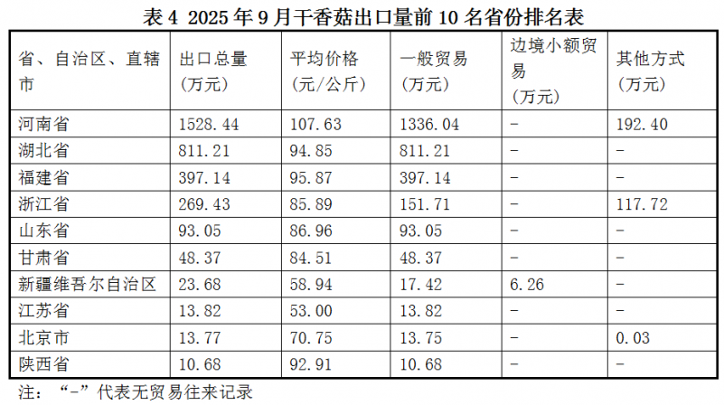 2025年9月我国干香菇出口目的地主要为东南亚、东亚、北美、东欧以及中国港澳台等地区。出口情况如下表所示: