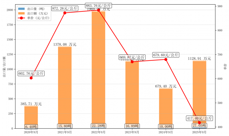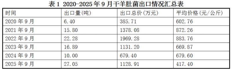 图1 2020-2025年9月干羊肚菌出口数量/金额/单价对比图