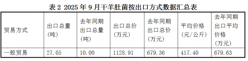 2025年9月干羊肚菌一般贸易出口量27.05吨,出口总价1128.91万元,平均单价为417.40元/公斤。如下表所示:
