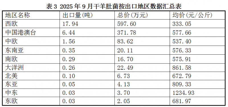 2025年9月我国干羊肚菌出口目的地主要为西欧、中欧、东南亚、南欧,以及中国港澳台等地区。出口情况如下表所示: