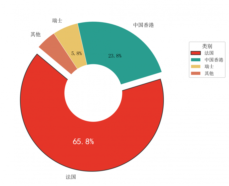 其中进口量前三的国家和地区为:法国进口量17.81吨、占总量的65.85%;中国香港进口量6.44吨、占总量的23.79%,瑞士进口量1.56吨、占总量的5.75%。如下图所示: