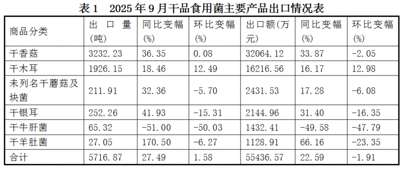 根据海关发布数据统计,我国干品食用菌出口商品目前包含7种,其中主要出口商品包含干香菇、干木耳、未列名干蘑菇及块菌、干银耳、干牛肝菌、干羊肚菌。9月干品食用菌合计出口量5716.87吨,出口总额55436.57万元。同比2024年9月,出口量增长1232.64吨(增幅27.49%),出口额增长10216.12万元(增幅22.59%),环比2025年8月,出口量增长88.97吨(增幅1.58%),出口额下降1077.33万元(降幅1.91%)。如下表所示: