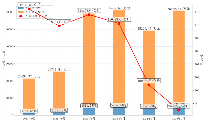 图1 2020-2025年9月干品食用菌出口量/出口额/平均价格对比图