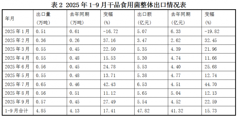 2025年1-9月我国食用菌出口总量同比去年干品食用菌呈现量价同增特征,出口总量48531.08吨,同比增长17.41%,出口总额478173.57万元,同比上升15.73%。9月出口量同比增长27.49%,至5716.87吨,出口额增长22.59%,至55436.57万元。2025年1-9月我国干品食用菌整体出口情况如下表所示: