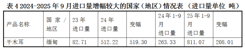 根据数据统计,部分国家(地区)2024年-2025年9月进口我国干品食用菌产品的数量发生了较大变化,需进一步关注。如下表所示: