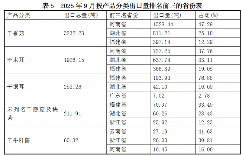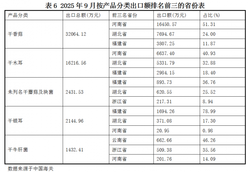 2025年9月我国干品食用菌出口总量为5716.87吨,出口量排名前三的省份是河南省、湖北省、福建省,出口量分别为2280.83吨、1556.49吨、1029.09吨,占总出口量比例分别为39.90%、27.23%、18.00%,对应出口额分别为23470.22万元、14229.27万元、9381.38万元。按产品分类排名前三的省份如下表所示: