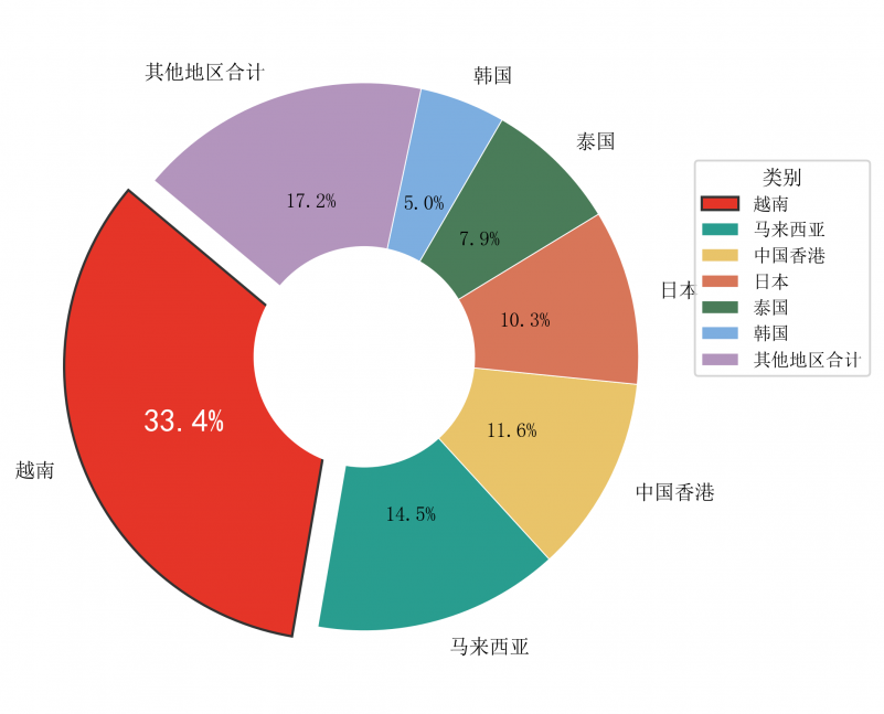 9月份我国干品食用菌出口主要目的地包含东南亚、东亚、北美以及中国港澳台等地区,其中东南亚、东亚以及中国港澳台占我国干品食用菌出口量的89.03%。分别占比为61.56%、15.38%、12.09%。9月我国干品食用菌出口目的地包含越南、马来西亚、日本、泰国,以及中国香港等共计67个国家及地区。占比如下图所示: