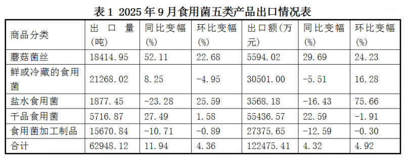 食用菌商务网对中国海关发布的2025年9月数据进行统计,我国食用菌出口五大类产品(蘑菇菌丝、鲜/冷藏食用菌、干品食用菌、盐水食用菌、加工制品),9月合计出口量62948.12吨,出口总额122475.41万元。同比2024年9月,出口量增长6712.32吨(增幅11.94%),出口额增长5074.11万元(增幅4.32%),环比2025年8月,出口量增长2627.85吨(增幅4.36%),出口额增长5739.82万元(增幅4.92%)。如下表所示: