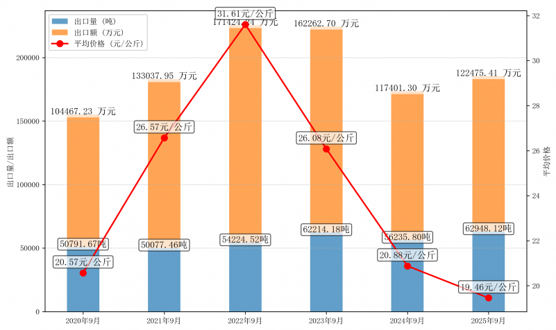 图1 2020-2025年9月食用菌商品出口量/出口额/平均价格对比图