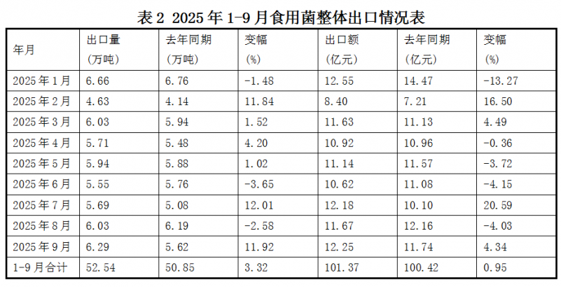 2025年1-9月我国食用菌出口总量同比去年呈现量价同增特征,出口总量52.54万吨,同比增长3.32%,出口总额101.37亿元,同比上升0.95%。9月出口量同比增长11.92%,至6.29万吨,出口额增长4.34%。2025年1-9月我国食用菌整体出口情况如下表所示: