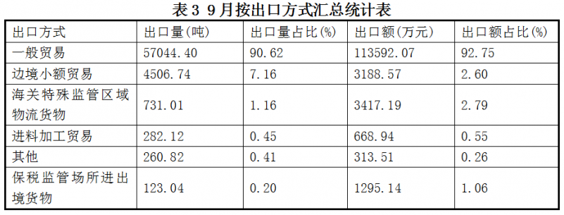 我国食用菌出口主要通过一般贸易(9月占比90.62%)、边境小额贸易(占比7.16%)等方式进行,其中海关特殊监管区域物流货物和保税监管场所进出境货物出口方式主要出口干木耳、干香菇和小白蘑菇罐头等高附加值的商品。虽然这两种方式出口量占比不高,但因产品价值较高,其出口额合计占比达3.85%,反映出高价值产品在特殊贸易渠道中的重要性。按贸易分类9月出口情况如下表所示: