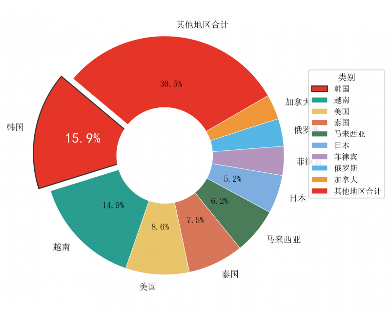 9月份我国食用菌出口主要目的地包含东南亚、东亚、北美、东欧等地区,其中东南亚、东亚、北美三个地区占我国食用菌出口量的69.88%。分别占比为36.55%、21.18%、12.15%。9月我国食用菌出口目的地包含韩国、越南、美国、泰国、马来西亚等共计124个国家及地区。占比如下图所示: