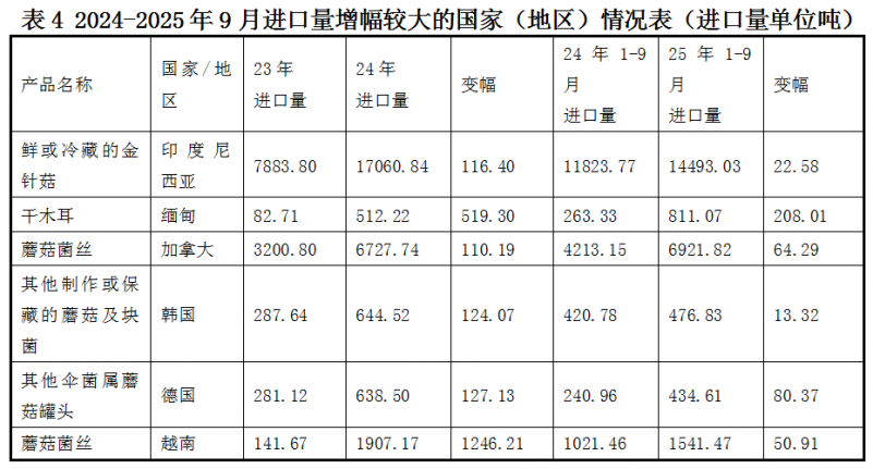 根据数据统计,部分国家(地区)2024年-2025年9月进口我国食用菌产品的数量发生了较大变化,需进一步关注。如下表所示: