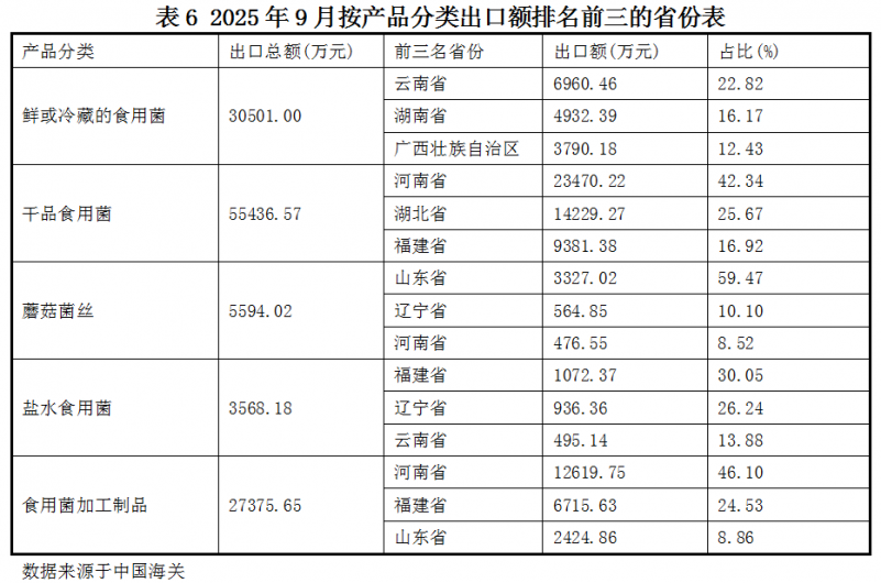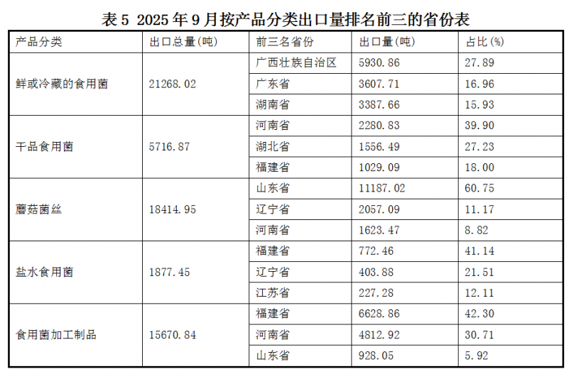 2025年9月我国食用菌出口总量为62948.12吨,排名前三的省份是山东省、福建省、河南省,出口量分别为13278.63吨、9729.81吨、8820.91吨,占总出口量比例分别为21.09%、15.46%、14.01%,对应出口额分别为7847.76万元、18234.85万元、36821.01万元。按产品分类排名前三的省份如下表所示: